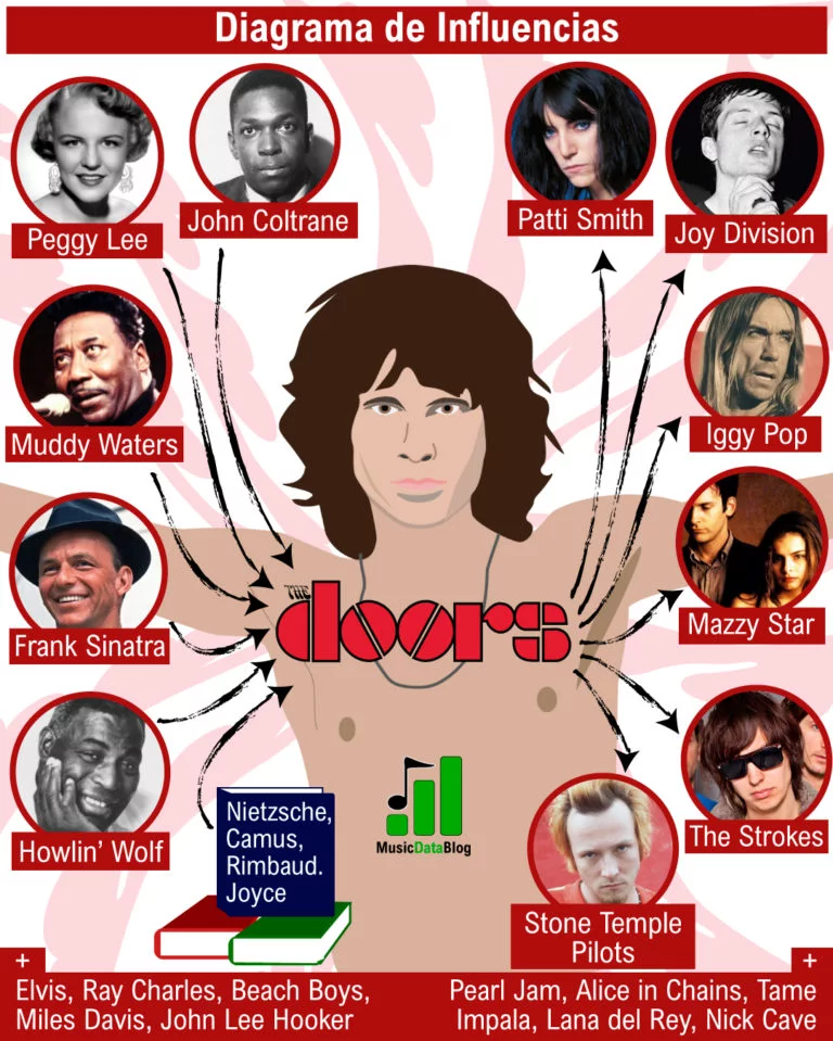 Entre las influencias de The Doors podemos destacar artistas de blues como Howlin’ Wolf, Albert King y Muddy Waters. Cantantes como Elvis Presley y Frank Sinatra eran favoritos de Morrison. Además, podemos sumar artistas de jazz como John Coltrane, Peggy Lee y Ray Charles.